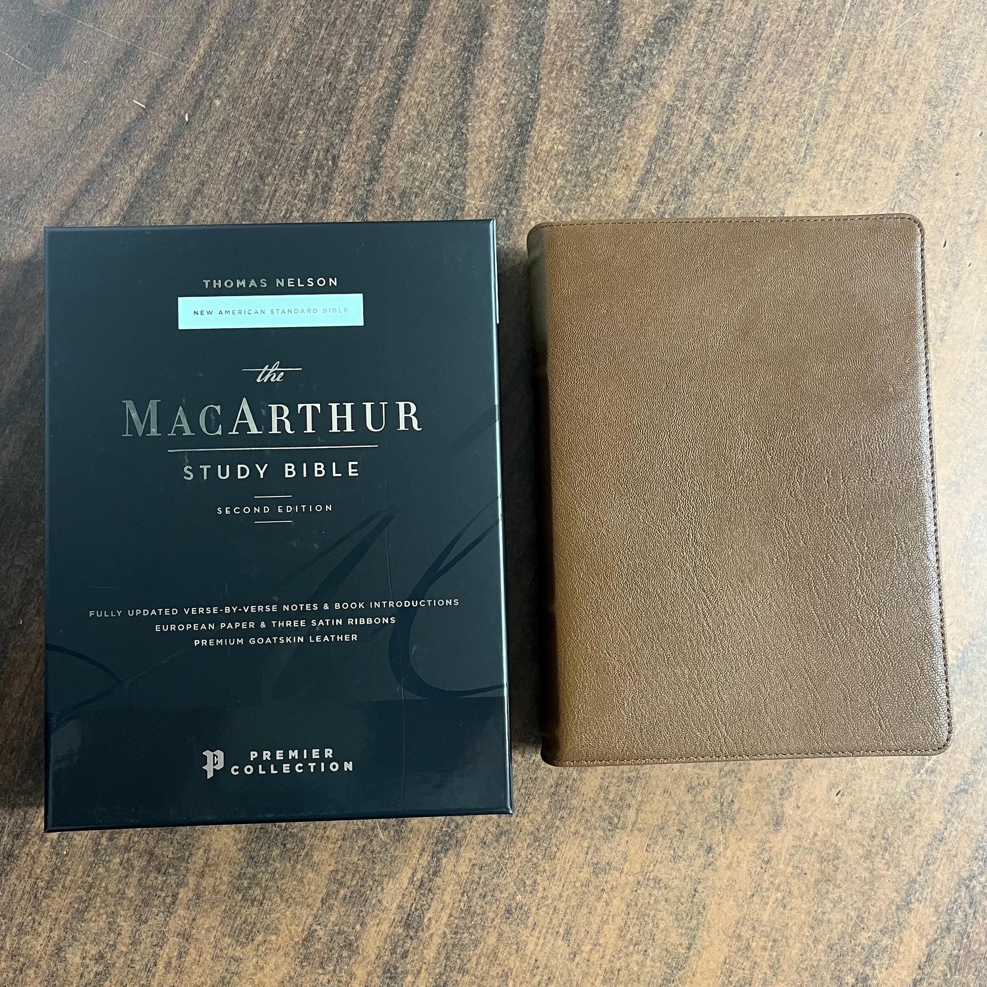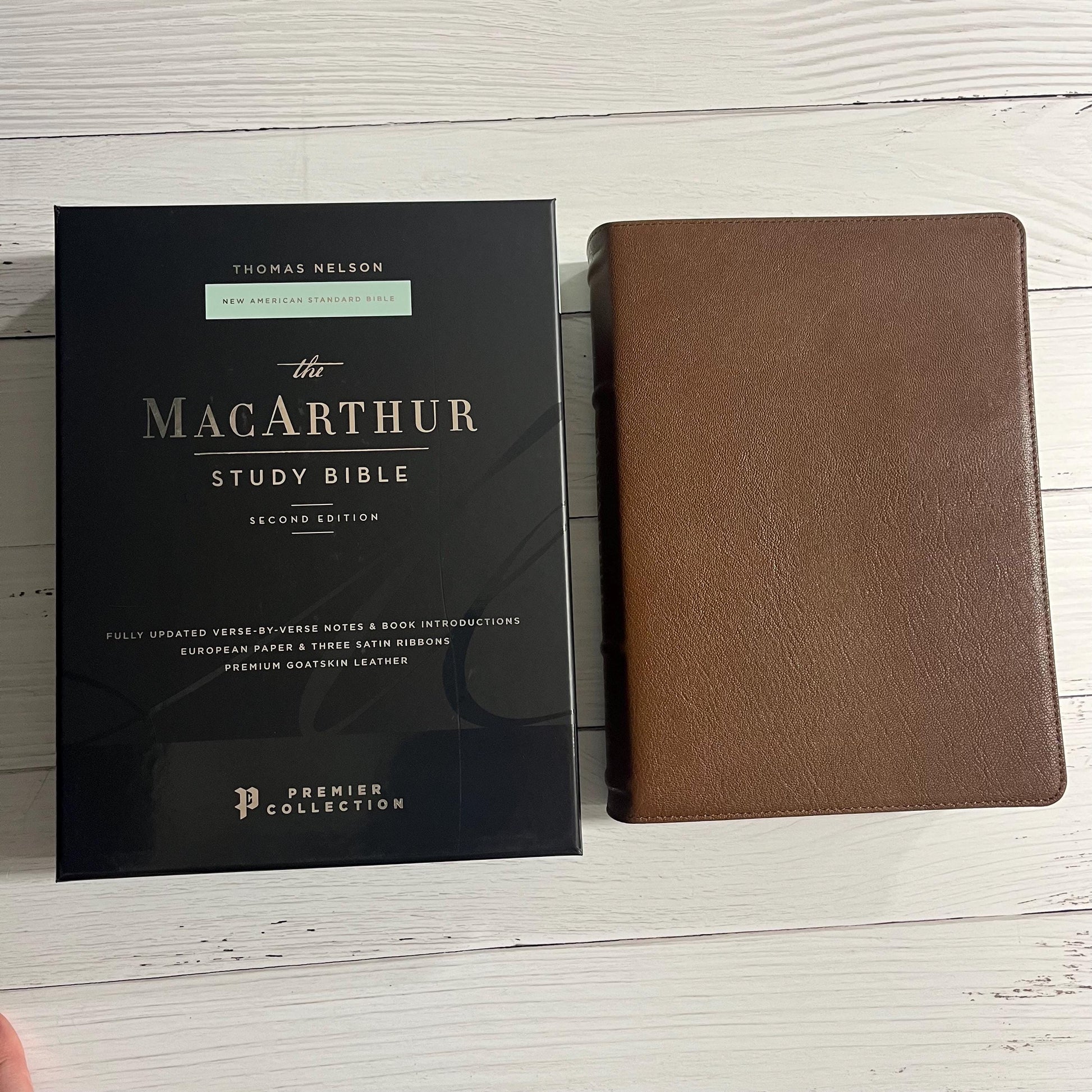Personalized NASB MacArthur Study Bible, Brown Premium Genuine Goatskin Leather, Premier Collection, ISBN 9780785230892 NASB 1995