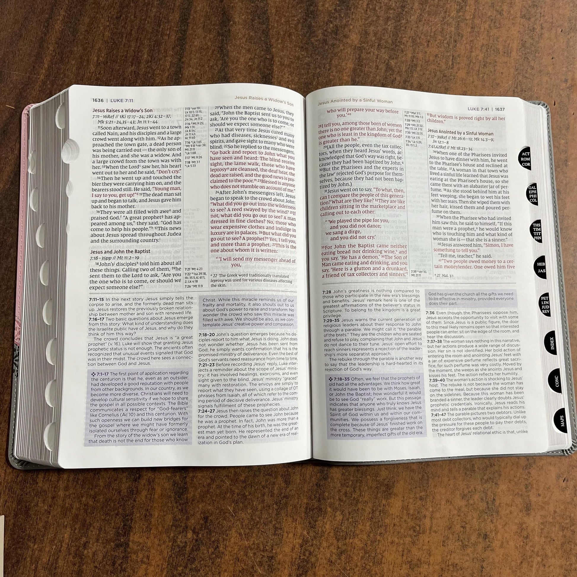 Personalized NIV Large Print Application Study Bible Thumb Indexed - Pink / Gray LeatherSoft, Custom Imprinted with name 9780310465348 (Update to Life Application Bible)